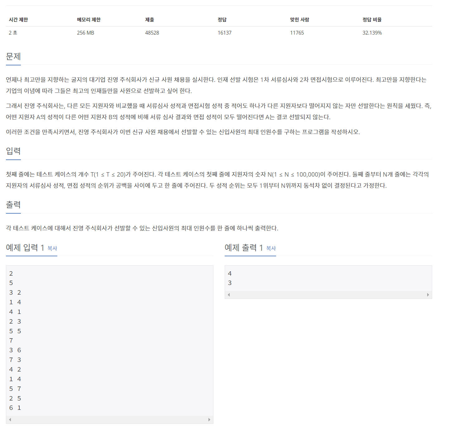 첫째 줄에는 테스트 케이스의 개수 T(1 ≤ T ≤ 20)가 주어진다. 각 테스트 케이스의 첫째 줄에 지원자의 숫자 N(1 ≤ N ≤ 100,000)이 주어진다. 둘째 줄부터 N개 줄에는 각각의 지원자의 서류심사 성