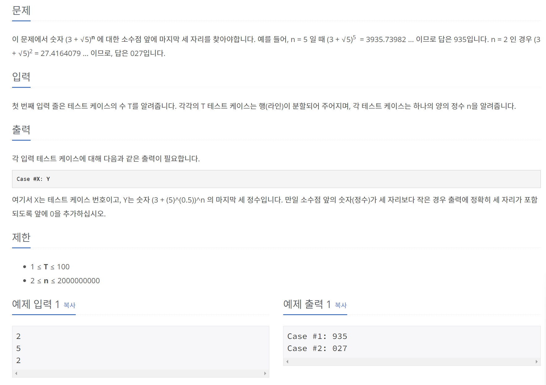 (3+√5)를 n제곱 했을 때 소수점 앞 세 자리를 찾는 문제