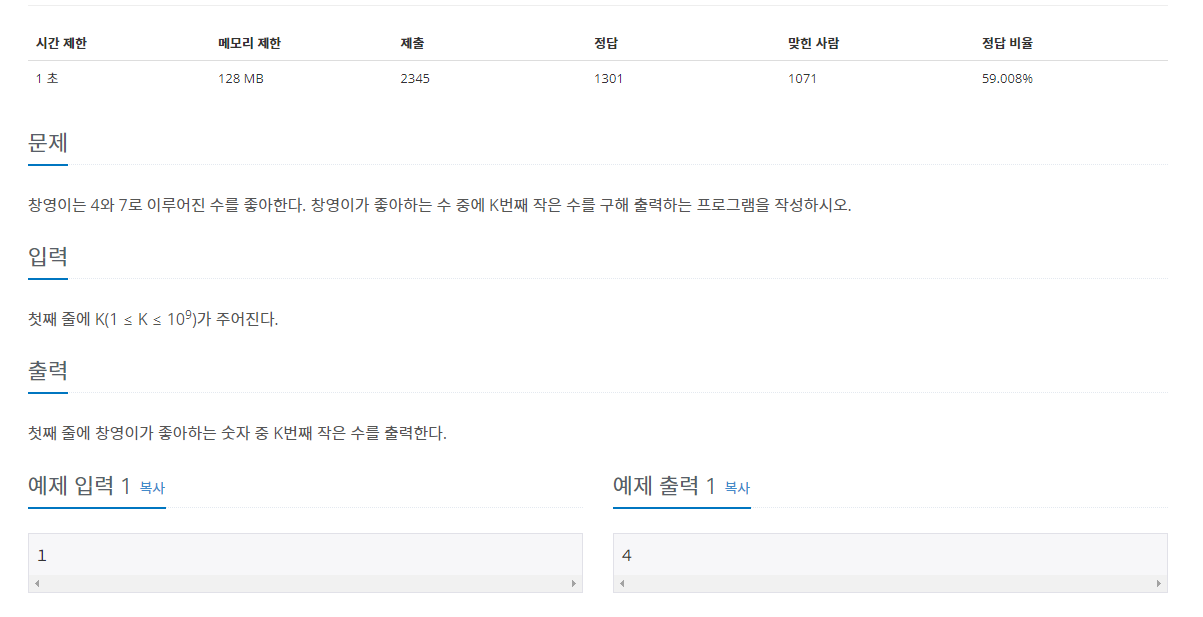 4와 7로 이루어진 수 중에서 K번째로 작은 숫자를 구해서 출력해 보자.
