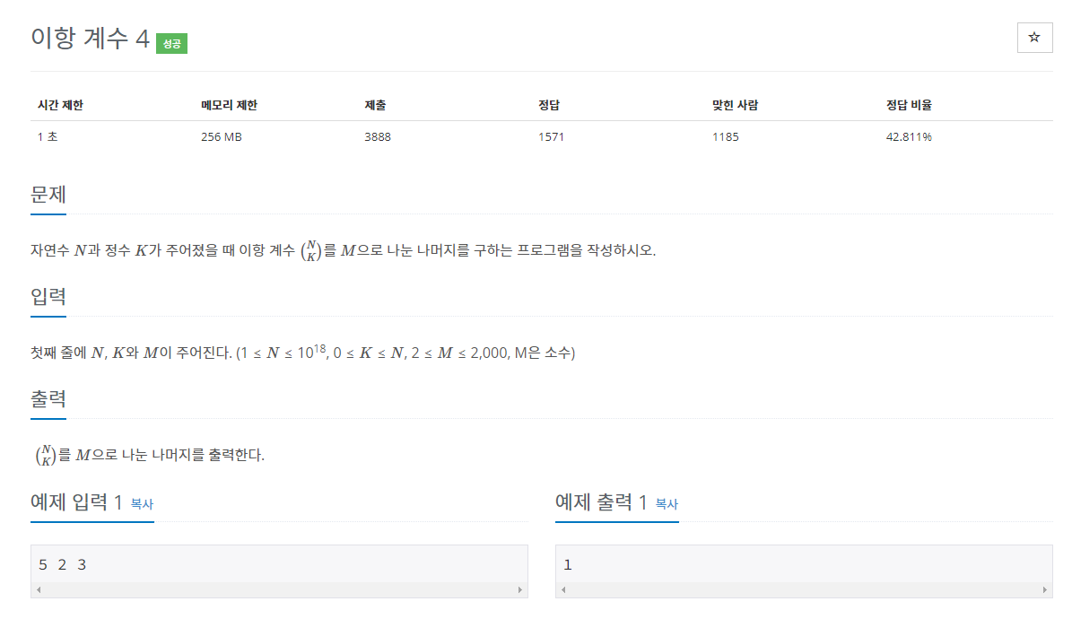 1. 문제의 요구 조건은 이항계수(조합)를 소수인 M으로 나누었을 때의 나머지를 구하는 문제이다. 2. 뤼카의 정리는 아래와 같은 식이 성립하는 것을 의미하는데 사실 단순히 이거만 봐서는 이해하기 어렵다.