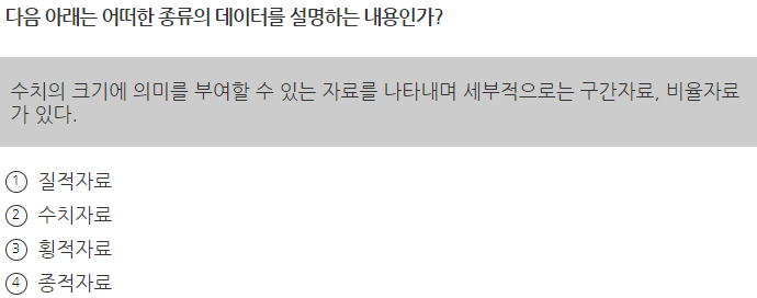 수치자료의 정의 : 수치의 크기에 의미를 부여할 수 있는 자료를 나타내며 구간 자료, 비율 자료가 여기에 속한다. (답 : 2)