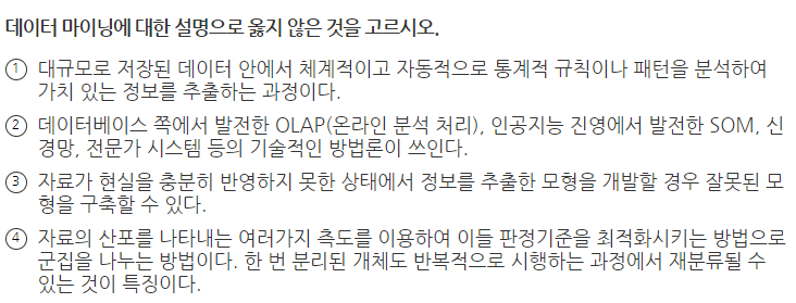 보기 4는 군집분석 중 비계층적 방법을 나타낸 내용이다. (답 : 4)