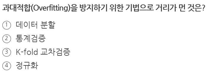 과적합 방지 기법에는 데이터 분할, K-fold 교차검증, 정규화 등의 방법이 있다. (답 : 2)