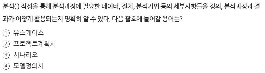 분석시나리오 작성을 통해 분석과정에 필요한 데이터, 절차, 분석기법 등의 세부사항들을 정의, 분석과정과 결과가 어떻게 활용되는지 명확히 알 수 있다. (답 : 3)