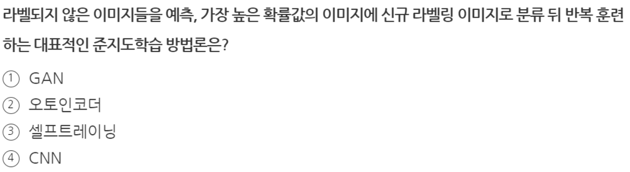 준지도학습의 셀프트레이닝은 레이블이 달린 데이터로 모델을 학습한 뒤 레이블 되지 않은 데이터를 예측하여 이 중에서 가장 확률값이 높은 데이터들만 레이블 데이터로 다시 가져간다. (답 : 3)