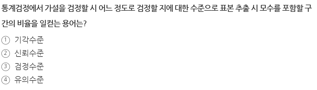 신뢰구간은 모수가 포함될 가능성이 있는 구간으로 구간의 비율은 신뢰수준이라고 한다. (답 : 2)