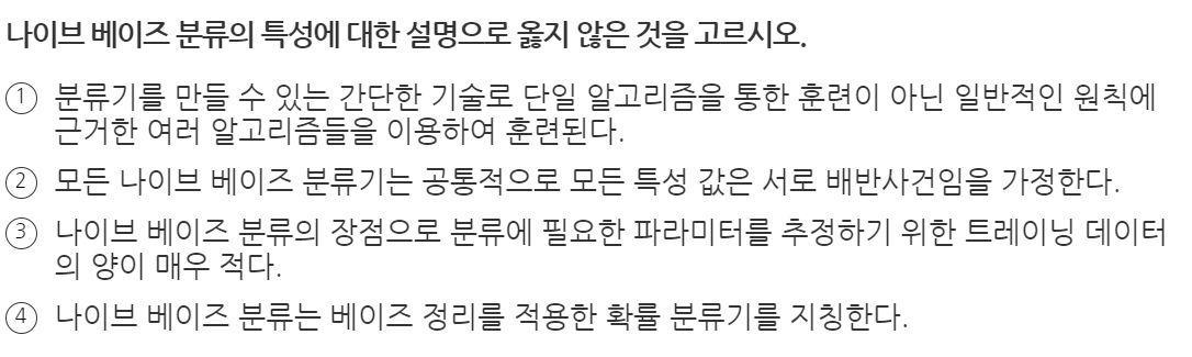 나이브 베이즈 분류기는 공통적으로 모든 특성 값은 서로 독립임을 가정한다. (답 : 2)