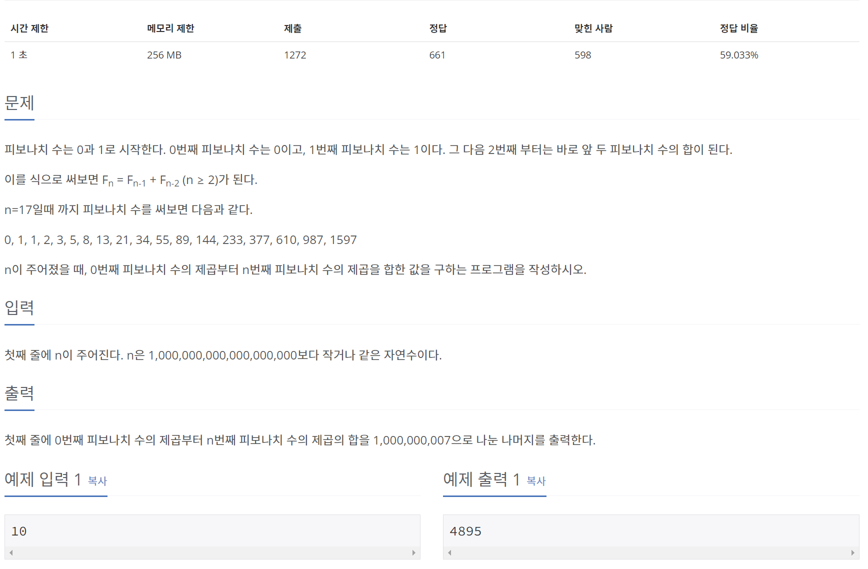 print(result[0][1]*result[0][0] % 1000000007) # 피보나치 제곱들의 합 = 피보나치n+1 * 피보나치n 이므로