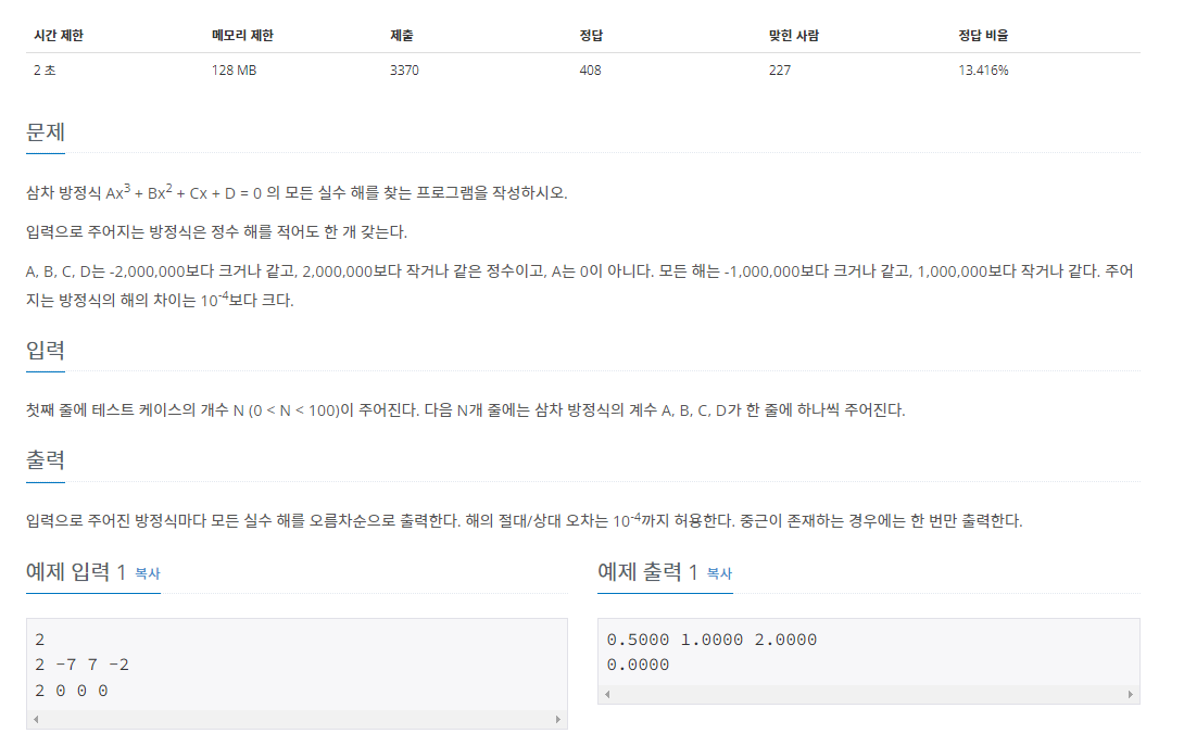 정수해 1개가 확정적으로 존재하는 삼차방정식의 해를 구해 출력해 보는 문제