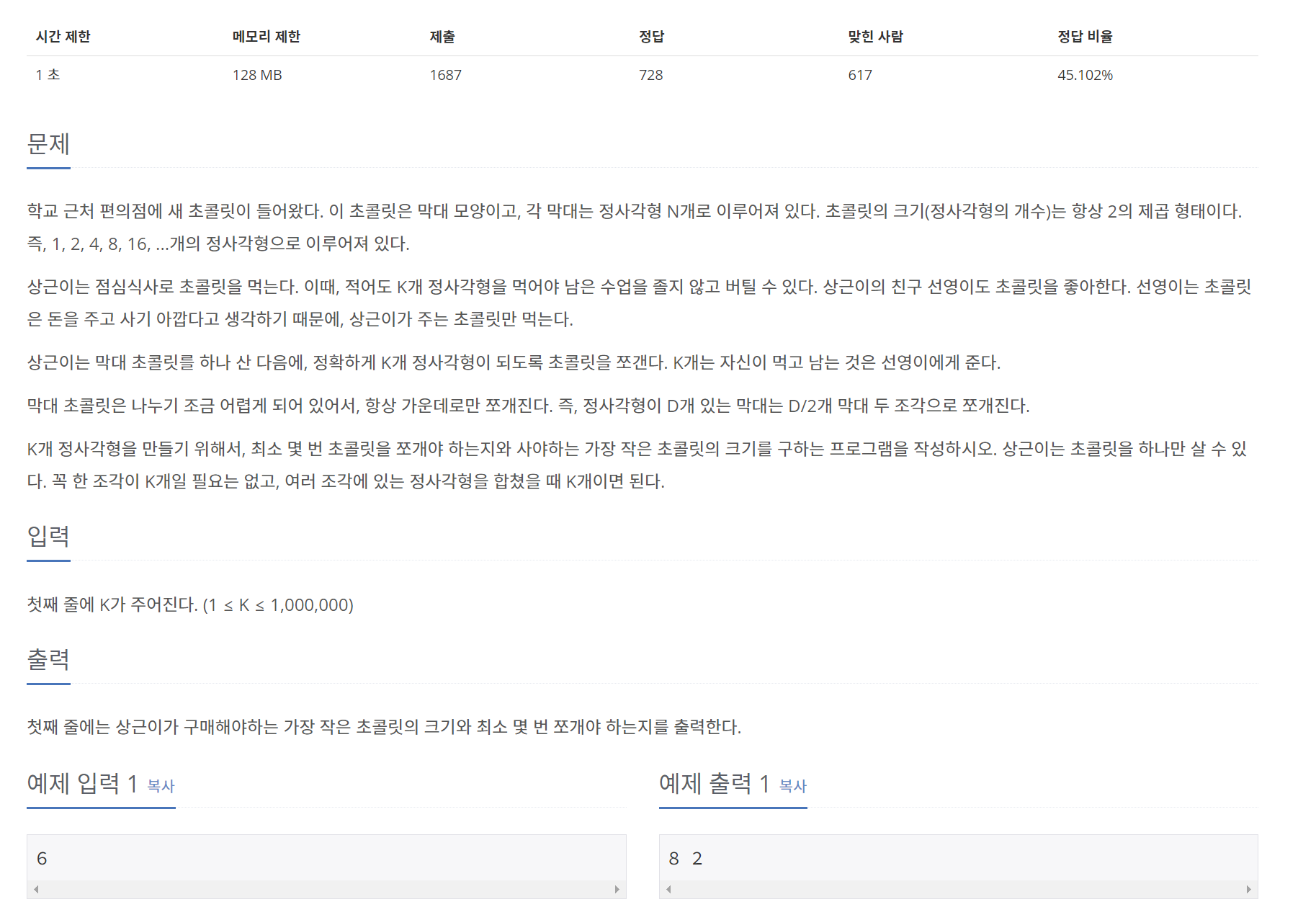 2의 n제곱 개의 정사각형으로 이루어진 초콜릿을 쪼개면서 원하는 개수만큼 먹고 싶을 때, 어느 크기의 초콜릿과 몇 번 쪼개야 가능한지 찾는 문제
