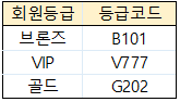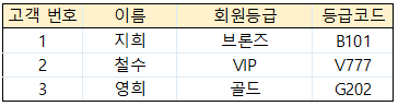 - 회원 등급은 고객 번호에 의해 결정되고, 등급코드는 회원 등급에 의해 결정되는 구조