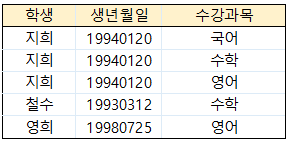 - 학생과 수강과목을 합친 [학생, 수강과목] 키로 각각 구별 가능 (학생과 수강과목을 알면 생년월일을 알 수 있음)