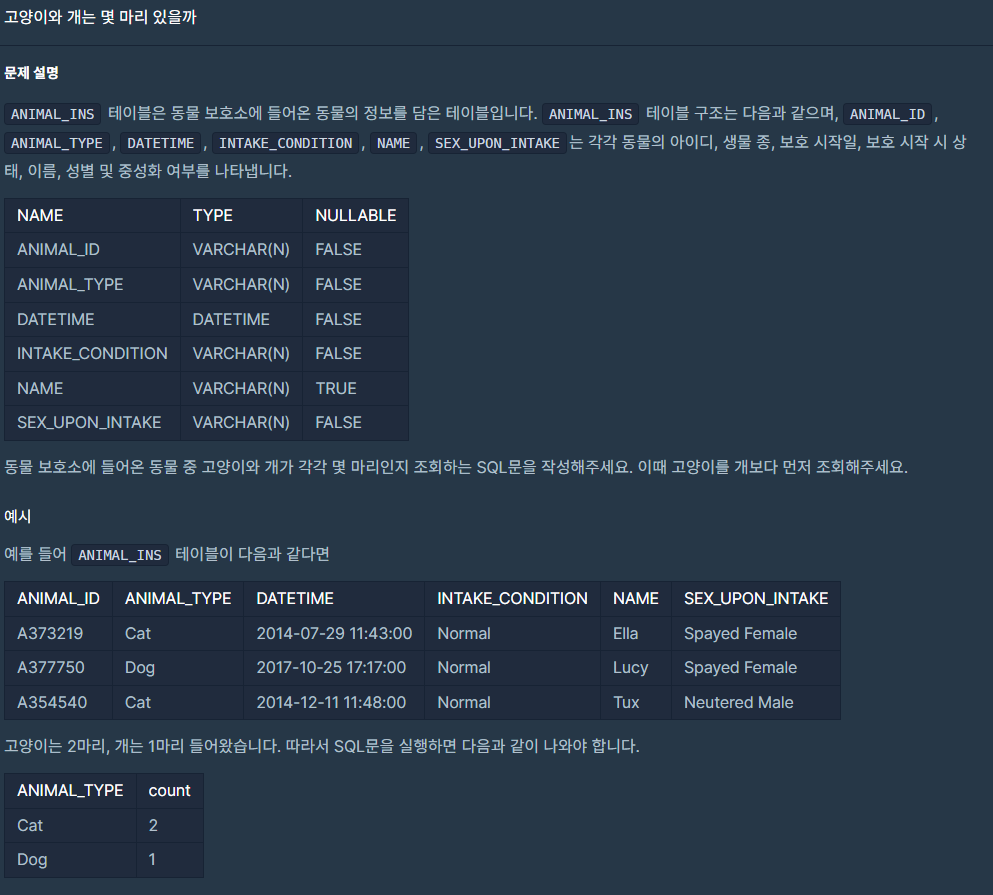 고양이와 개를 호출하는 SQL문을 작성해보는 문제