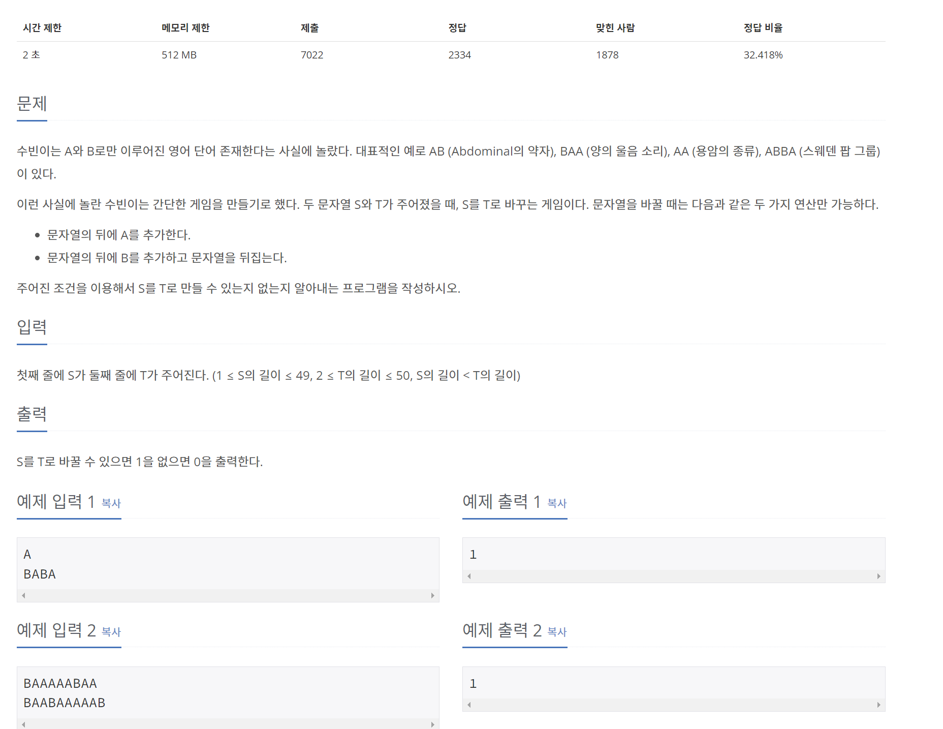 1. 요구 조건대로 하나씩 늘려가면서 탐색하는 방법도 있겠지만, 반대로 T를 S로 만드는 게 더 간단하겠다 싶어서 T를 S로 만드는 방향으로 접근했다.