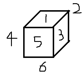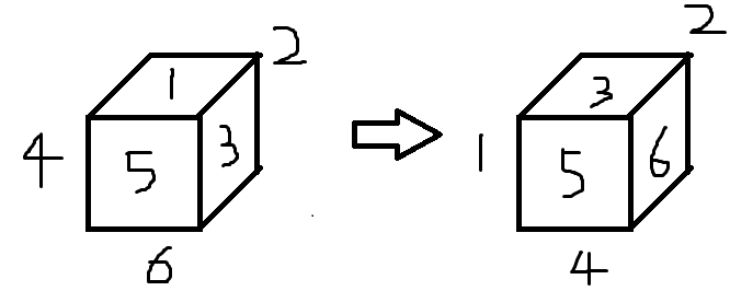 1. 주어진 도면의 주사위를 생각해 보자. 주사위 각 면에 해당하는 위치를 [1, 2, 3, 4, 5, 6]이라고 생각하고 진행해 보자.