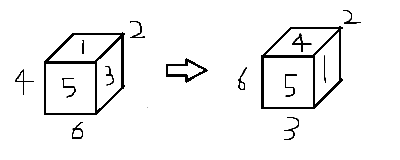 dice[0], dice[1], dice[2], dice[3], dice[4], dice[5] = dice[2], dice[1], dice[5], dice[0], dice[4], dice[3] # 주사위 변화 3 2 6 1 5 4