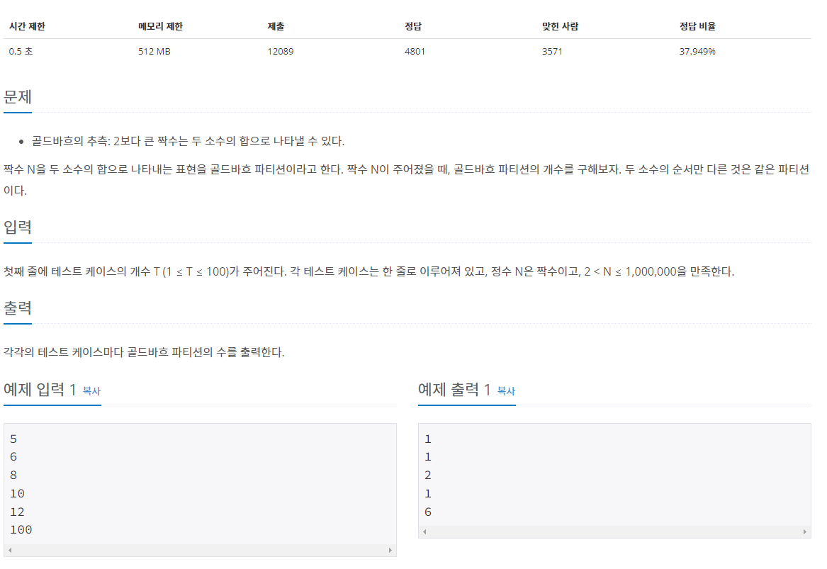 짝수 N이 주어졌을 때 두 소수의 합으로 나타낼 수 있는 경우의 개수를 세는 문제