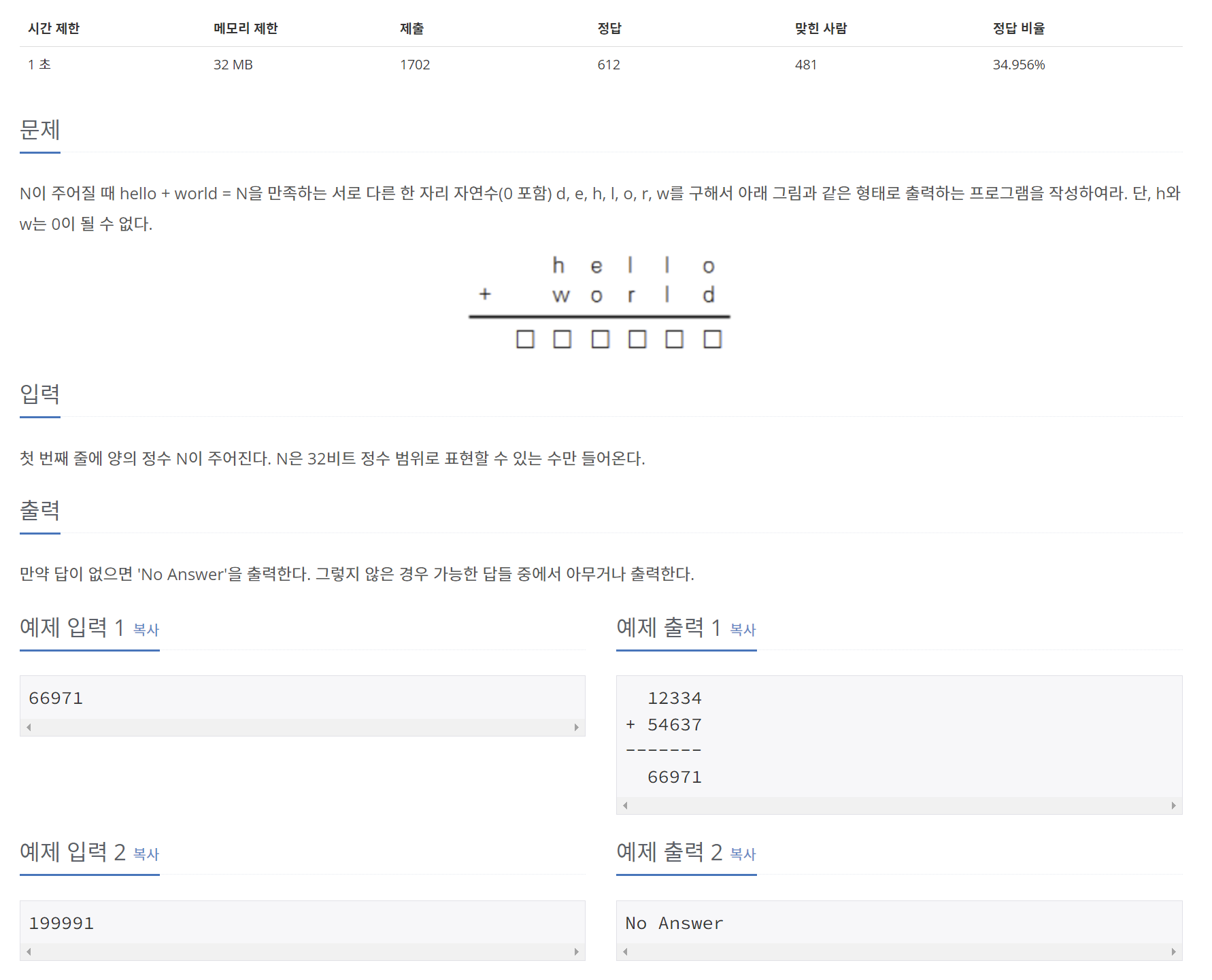 N이 주어질 때 hello + world = N을 만족하는 서로 다른 한 자리 자연수(0 포함) d, e, h, l, o, r, w를 구해서 아래 그림과 같은 형태로 출력하는 프로그램을 작성하여라. 단, h와 w는 0이 될 수 없다.