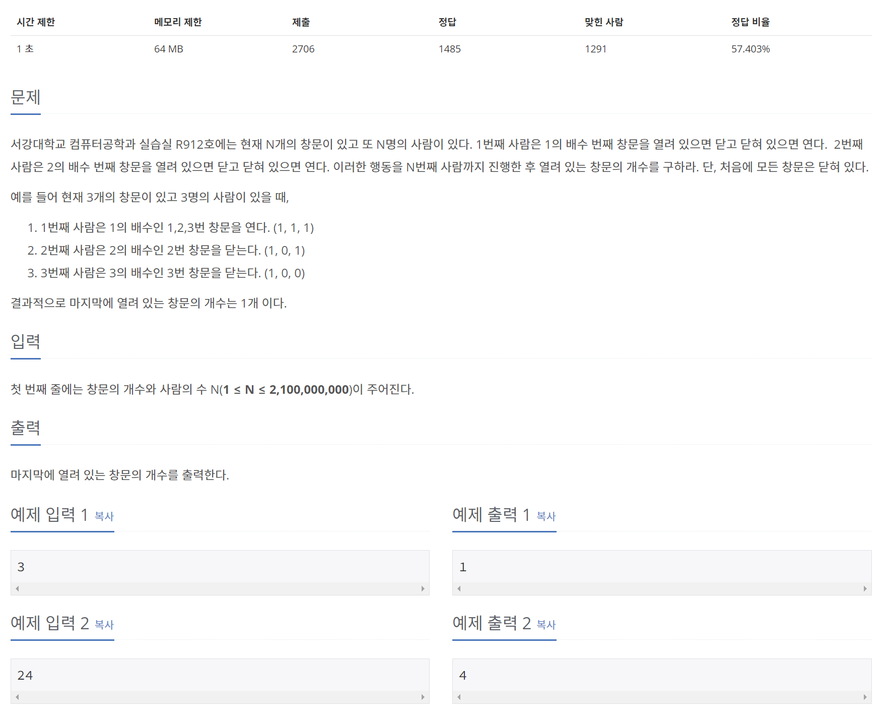 N 개의 창문이 있을 때, 1부터 시작해서 해당 수의 배수만큼 닫혀있으면(0) 열고(1), 열려있으면(1) 닫고(0)를 반복하고, 최종적으로 열려있는 창문의 개수를 확인하는 문제