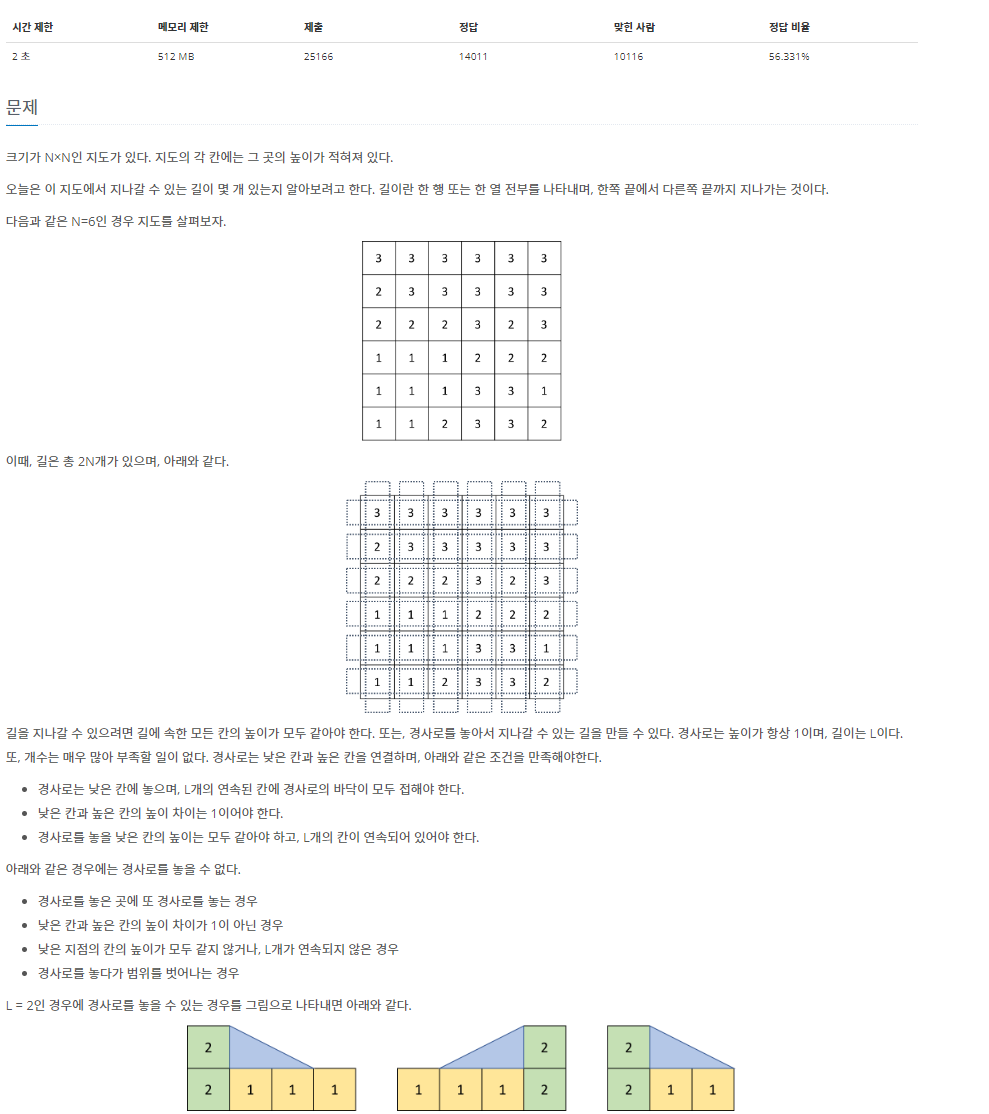 요구 조건에 맞게 경사로를 놓아서 지나갈 수 있는지 횟수 체크하는 구현 문제