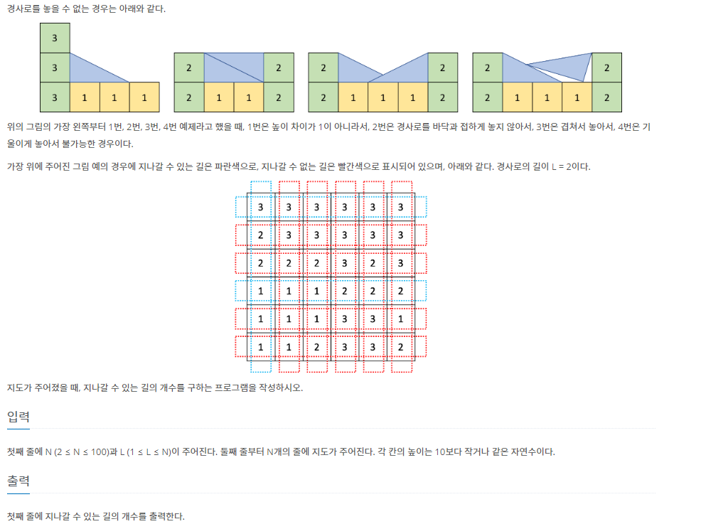 # 조건 3-1 : 경사로는 낮은칸에 놓이고, L개의 연손된 칸에 경사로 바닥이 모두 접해야함