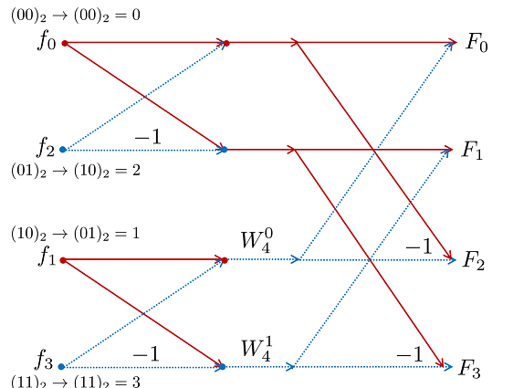 쿨리-튜키 알고리즘은 FFT 결과를 계산하는 가장 일반적으로 사용되는 알고리즘 표본의 크기를 M이라할 때 M = 2이면 출처 : https://ghebook.blogspot.com/2022/10/fast-fourier-transform.html
