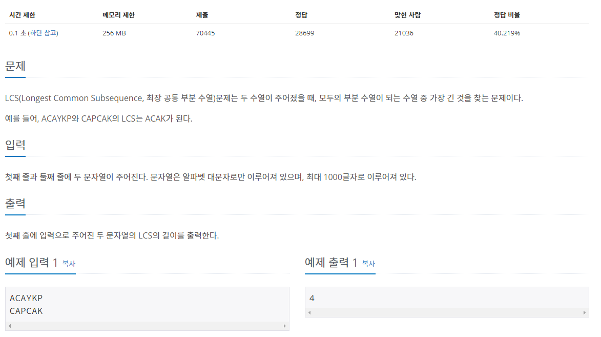 LCS(Longest Common Subsequence, 최장 공통 부분 수열)문제는 두 수열이 주어졌을 때, 모두의 부분 수열이 되는 수열 중 가장 긴 것을 찾는 문제이다. 예를 들어, ACAYKP와 CAPCAK의 LCS는 ACAK가 된다.