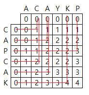 2. 표를 보면 같은 알파벳이 나오는 부분을 기준으로 +1씩 늘어나는 구조고, 겹치지 않는 부분은 인덱스 i와 j를 기준으로 [i][j]의 값은 위쪽 칸인[i-1][j] , 위쪽 칸인[i][j-1] 두개의 값 중 큰 값을 가져가는 형태임을 확인할 수 있다.