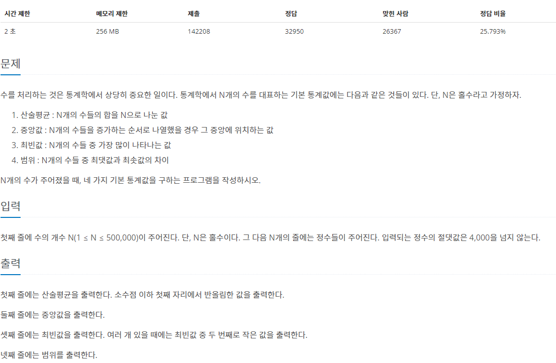 산술평균, 중앙값, 최빈값, 범위를 구해서 출력하는 문제