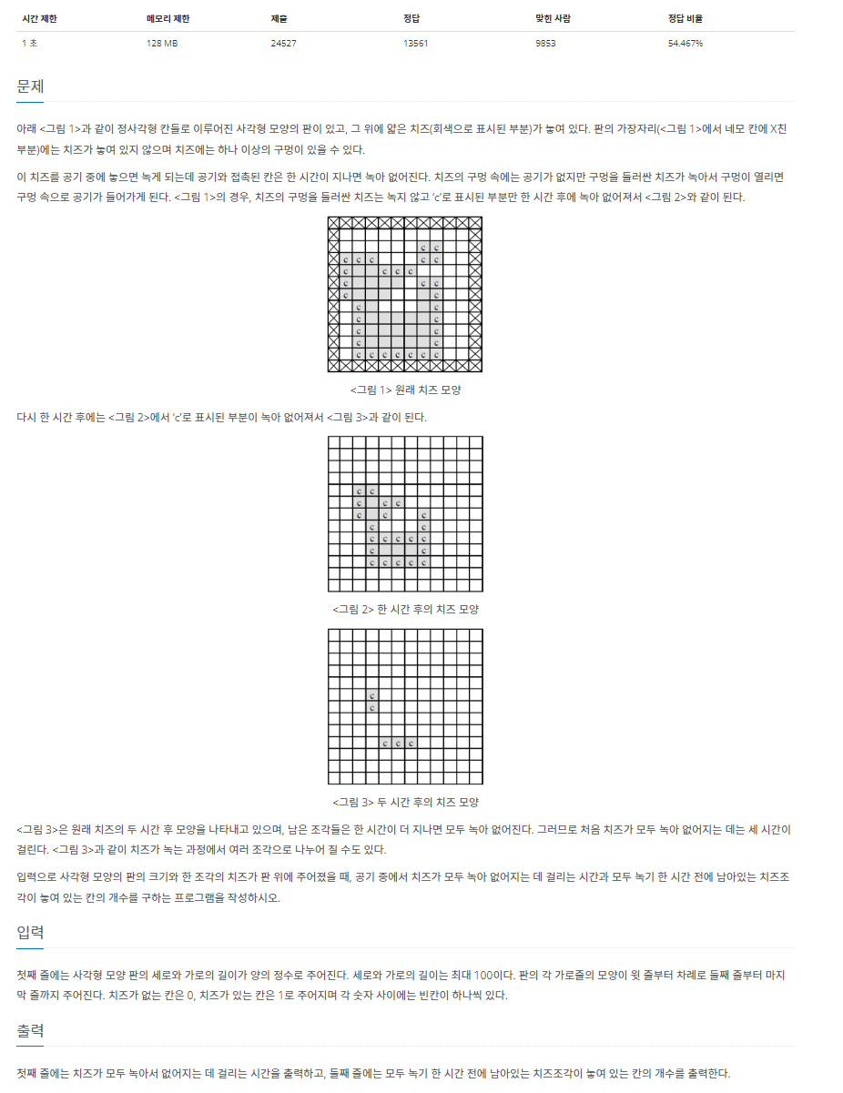 아래 <그림 1>과 같이 정사각형 칸들로 이루어진 사각형 모양의 판이 있고, 그 위에 얇은 치즈(회색으로 표시된 부분)가 놓여 있다. 판의 가장자리(<그림 1>에서 네모 칸에 X친 부분)에는 치즈가 놓
