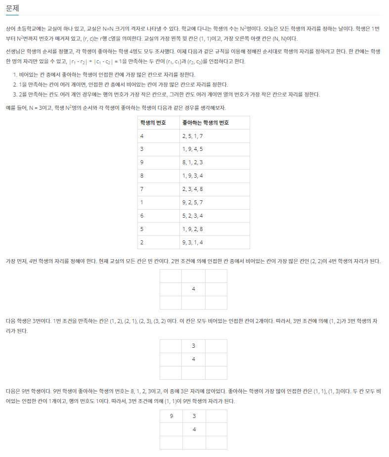 상어 초등학교에는 교실이 하나 있고, 교실은 N×N 크기의 격자로 나타낼 수 있다. 학교에 다니는 학생의 수는 N2명이다. 오늘은 모든 학생의 자리를 정하는 날이다. 학생은 1번부터 N2번까지 번호
