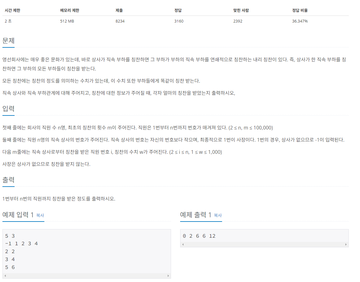 1. 상사가 받는 칭찬은 본인 보다 부하인 직급에 모두 더해진다. 그러므로 받은 칭찬을 우선적으로 구하고, 해당 상사의 부하들에 대해 칭찬 수를 증가해주면 된다.