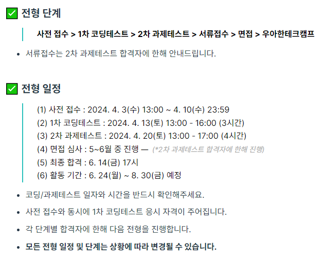 특히, 모집 분야가 백엔드이고 자바 베이스로 진행하는 만큼 자바로 따로 백엔드 교육을 직접적으로 받은 적이 없는 나에게 백엔드 역량을 제대로 강화시켜줄 기회라고 생각했다. 서류를 사전 제출하는 것이 아닌, 코딩테스트 및 과제테스트를 모두 통과해야 서류를 내고 면접을 진행할 기회가 주어졌기에 망설임 없이 신청했던거 같다.