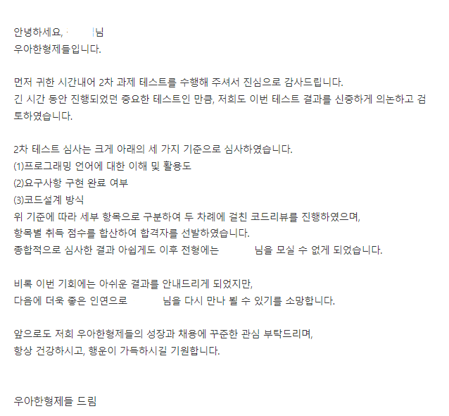 다만, 아쉽게도 과제테스트에서 탈락하였고, 이에 대해 간단한 후기 남겨보고자 한다.