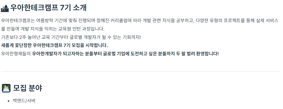 우아한테크캠프와 다르게 교육형 인턴 + 우아한 형제들 채용 기회까지 주어진다고 하여 굉장히 좋은기회라 생각하고 지원하게 됐다.