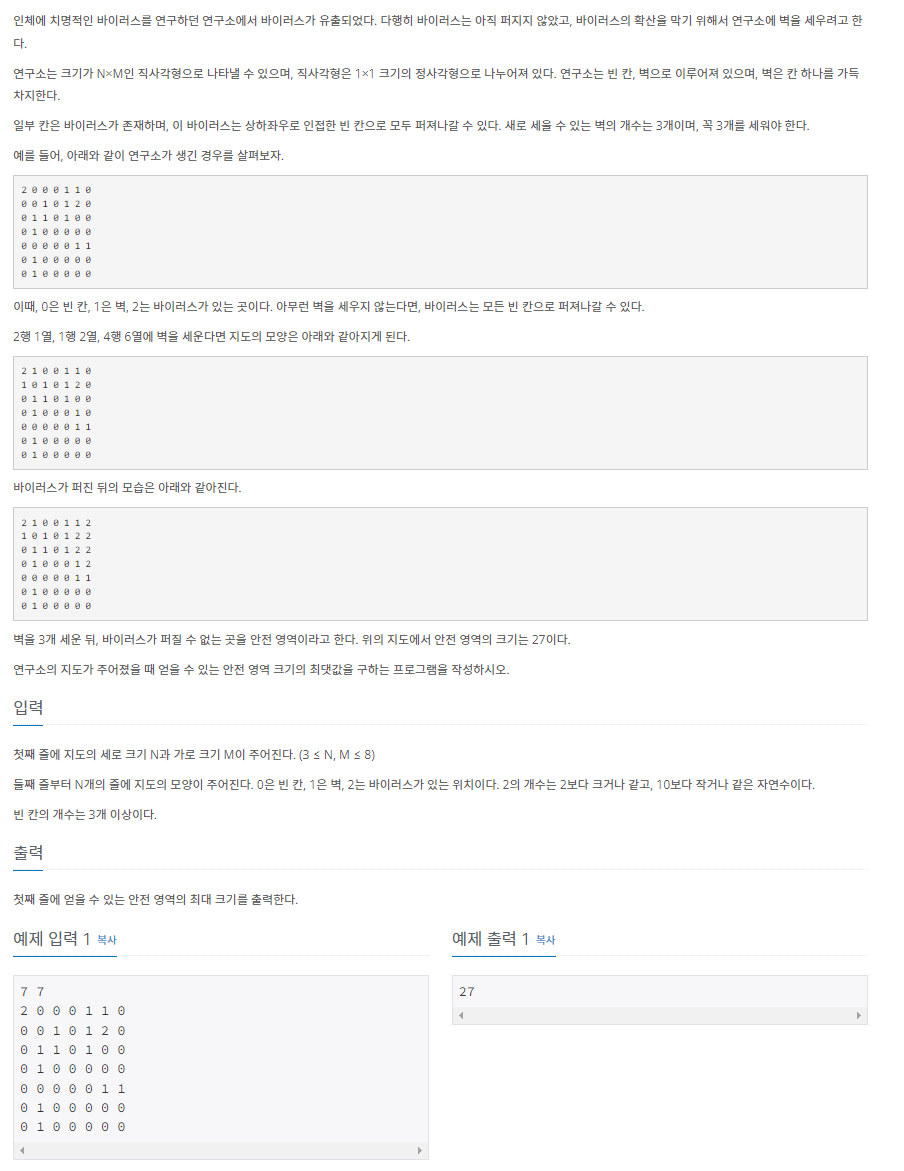 3. 벽 3개를 세워주는 조건. 이게 가장 구현의 핵심이자 어려운 부분이 아닐까 싶다. 벽 3개를 고르는 과정을 재귀를 이용하여 구현해주었다. (wall 함수 내 else문) 벽을 3개 세우고 나서는 1,2 번을 이용하여 바이러스를 이동시켰고, 이때의 0의 갯수의 최대 값을 찾아서 출력해주는 형식으로 구성했다. 이 과정에서 연구소 지도(maps)를 유지한채로 넣어야하므로 깊은 복사를 통해 하나를 복사해서 거기에 시도해 보는 형식으로 코드를 짯다.