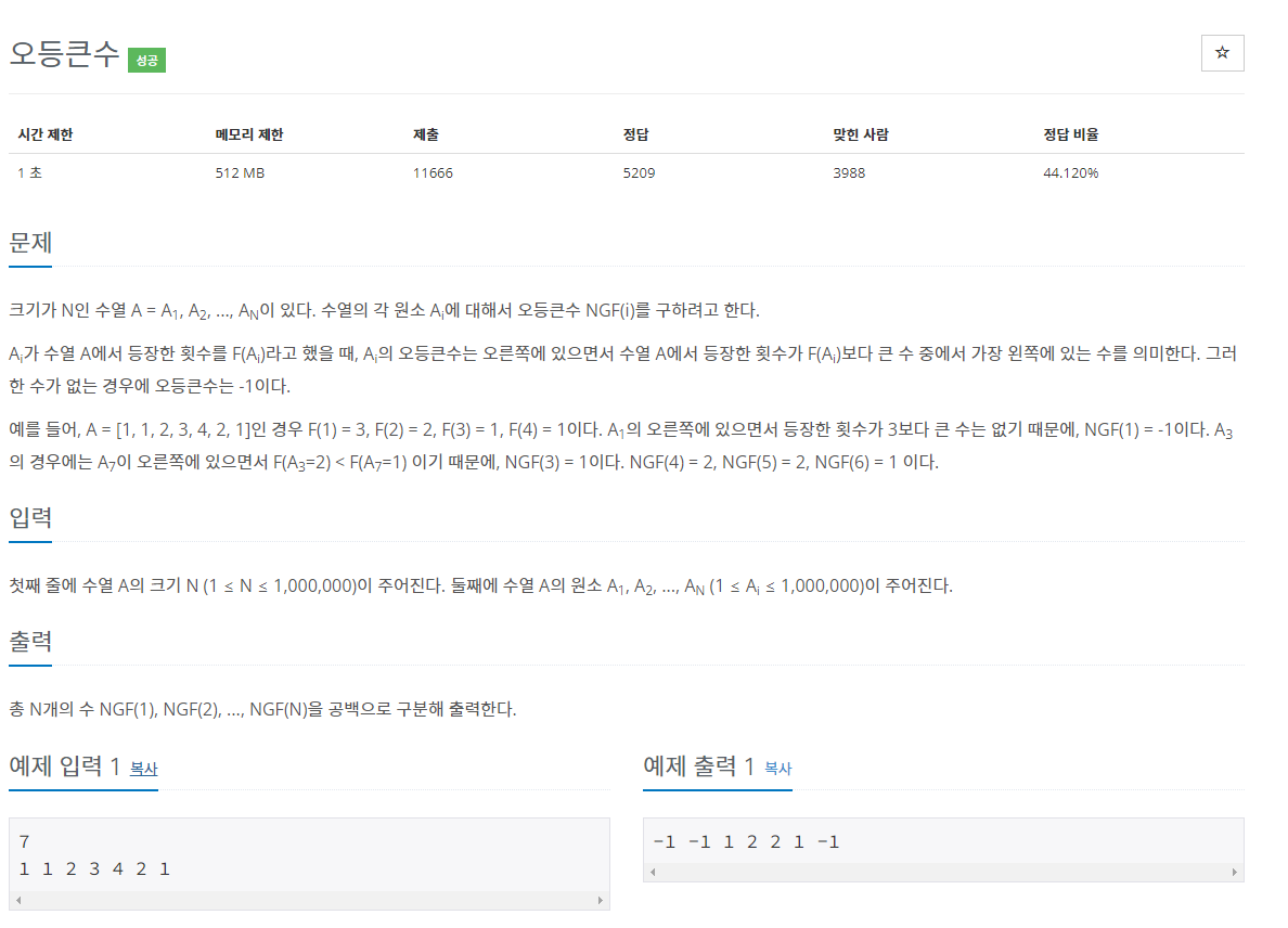 A의 오등큰수는 오른쪽에 있으면서 수열에서 등장한 횟수가 A보다 큰 수중에서 가장 왼쪽에 있는 수로 알 수 있는데, 이때의 오등큰수 리스트를 출력하는 문제