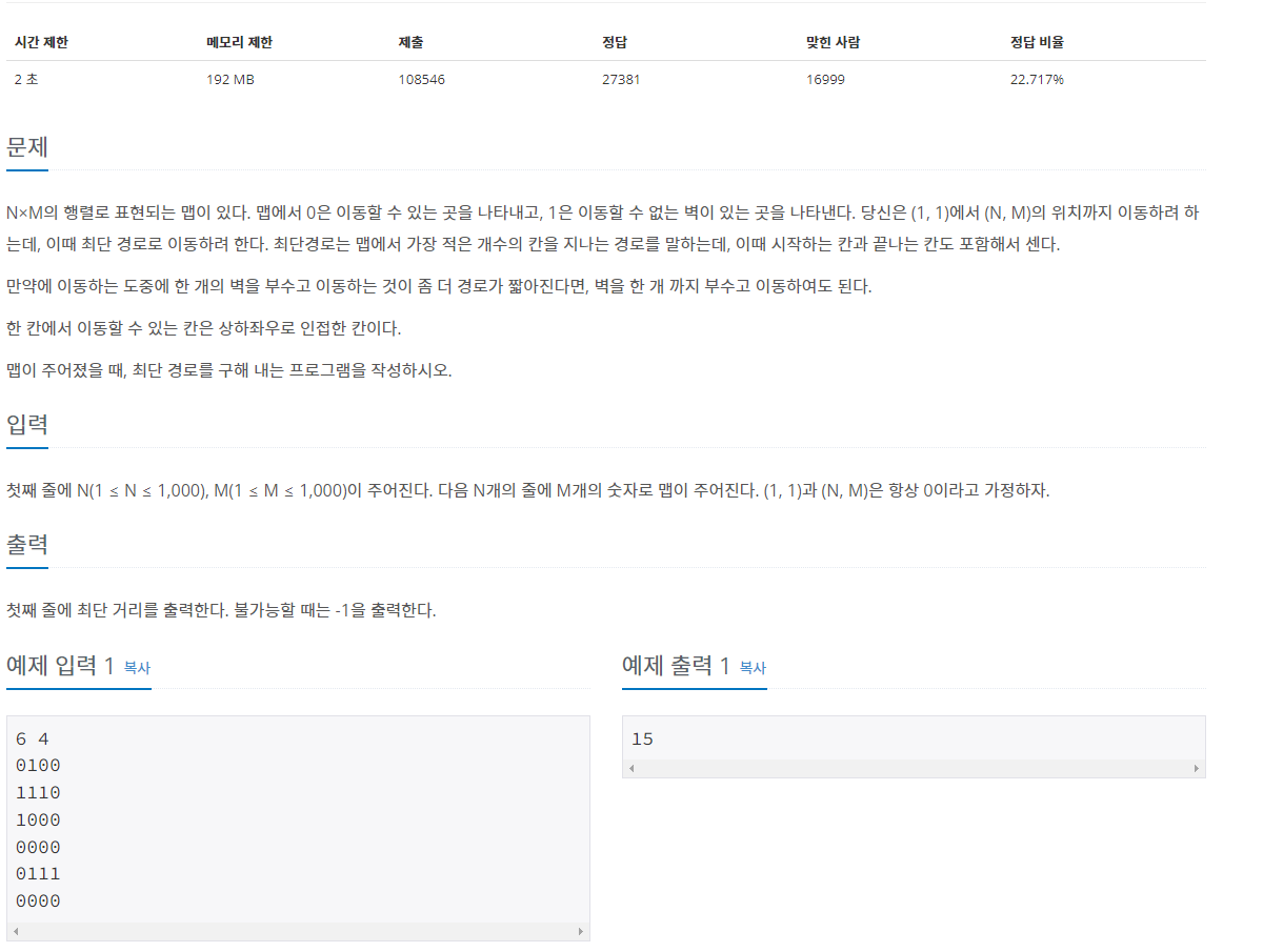 N×M의 행렬로 표현되는 맵이 있다. 맵에서 0은 이동할 수 있는 곳을 나타내고, 1은 이동할 수 없는 벽이 있는 곳을 나타낸다. 당신은 (1, 1)에서 (N, M)의 위치까지 이동하려 하는데, 이때 최단 경로