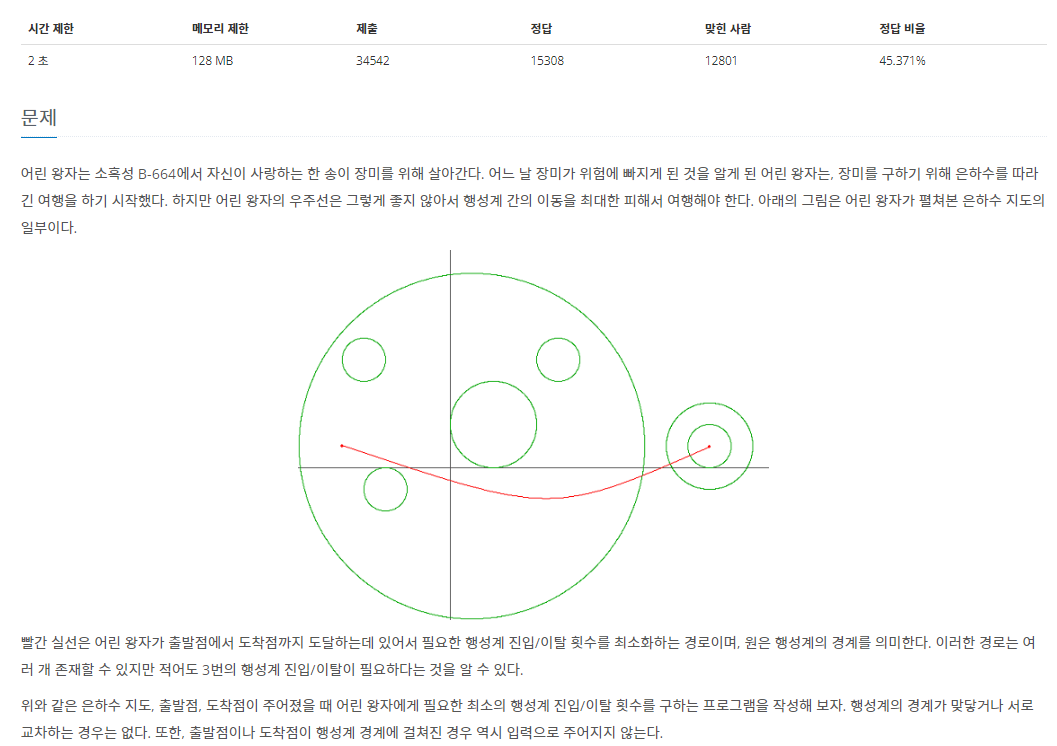 목표 지점까지 도착하기 위해서 최소 몇개의 원을 거쳐야 하는지 세보는 문제